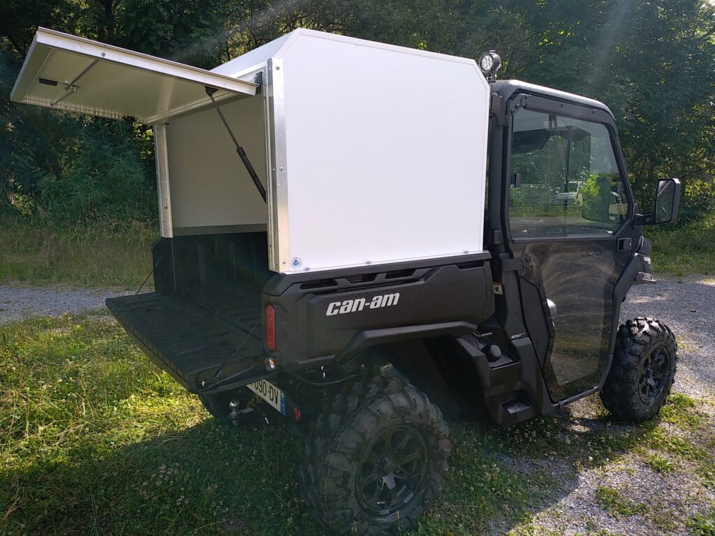 Le Hard Top est une couverture rigide en nid d’abeille aluminium 15mm. Leger et extrèmement solide, des charges peuvent être fixées dessus et des accessoires sur les cotés (porte ski, outils, eclairage…) Les arrimages de charges se font par des rails en alu type aviation.